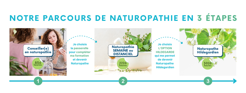 Nous avons imaginé et conçu pour VOUS, un parcours de Naturopathie sur-mesure, qui vous permet d’accéder aux métiers du bien-être à votre rythme et selon votre projet professionnel. Il vous est possible de débuter l’une de nos 3 formations : conseiller en naturopathie, naturopathe semaine ou naturopathe distanciel, ou bien naturopathe Hildegardien, selon vos critères et objectifs professionnels. À l’issue de votre formation, vous pourrez également choisir d’intégrer le cursus suivant pour compléter et consolider vos connaissances et obtenir une certification plus pointue.
